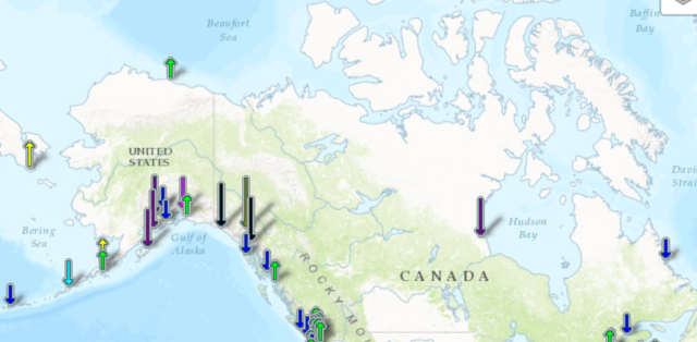 Bild 9 Tidenpegel um Alaska. Pfiele kennzeichnen die Änderungsrichtung und Größe. Quelle: NOAA Tides Current