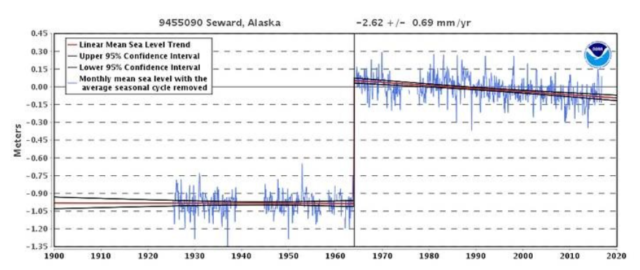 Aber auch dies hat mit einem Klimawandel nichts zu tun. Die meisten Tidenpegel um Alaska fallen nämlich entgegen dem allgemeinen Trend.
