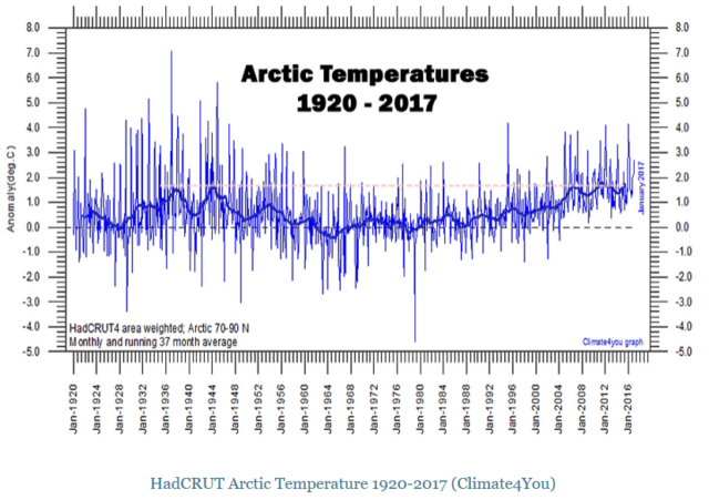 Ebenfalls schon öfters wurde publiziert, dass die Arktis zwar wärmer wird als der globale Durchschnitt, aber gerade erst die Temperaturen von vor 100 Jahren (aber bei weitem nicht deren Extreme) erreicht hat, wie es auch offizielle Daten stichhaltig ausweisen.