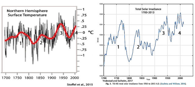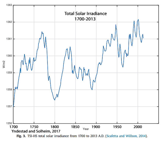 Yndestad and Solheim, 2017: Deterministische Modelle auf der Grundlage der stationären Perioden bestätigen die Ergebnisse durch eine enge Korrelation mit lange bekannten solaren Minima seit dem Jahr 1000 und zeigen eine Periode des Modernen Maximums von 1940 bis 2015. Das Modell berechnet ein neues Sonnenflecken-Minimum vom Dalton-Typ etwa für die Jahre von 2025 bis 2050 sowie eine neue Periode des TSI-Minimums vom Dalton-Typ von etwa 2040 bis 2065. … Perioden mit wenigen Sonnenflecken sind verbunden mit geringer Sonnenaktivität und kalten Klimaphasen. Perioden mit vielen Sonnenflecken sind verbunden mit hoher Sonnenaktivität und warmen Klimaphasen.
