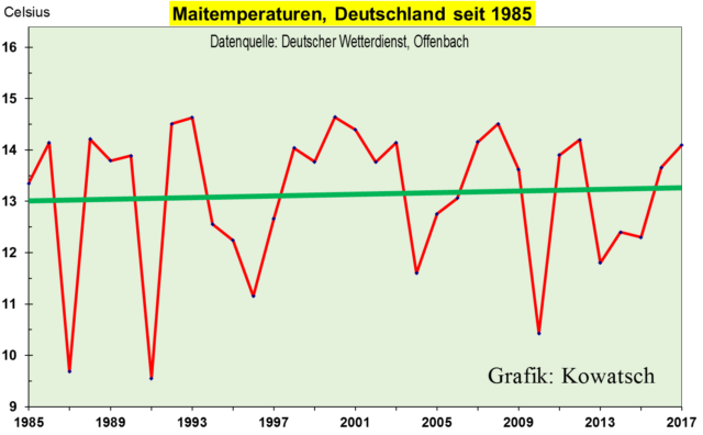 Noch eine kleine Korrektur: Der DWD hat die Maitemperatur für 2017 nun endgültig auf 14,1C festgelegt. In den Diagrammen haben wir noch den vorläufigen Wert 14,2C verwendet. An den Trendlinien ändert sich natürlich kaum etwas.
