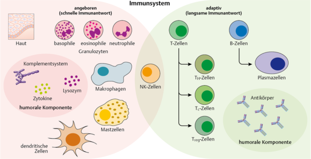 Abb.20 (Quelle) zeigt vereinfacht die verschiedenen Einheiten des angeborenen und des adaptiven Immunsystems und als Nk-Zelle (granulierte Lymphozyten) eine Schnittstelle, die in Verbindung des adaptiven Immunsystems, über eine komplexe Signalkaskade aktiviert wird und bei fremden oder entarteten Zellen den programmierten Zelltod, die Apoptose, auslöst.