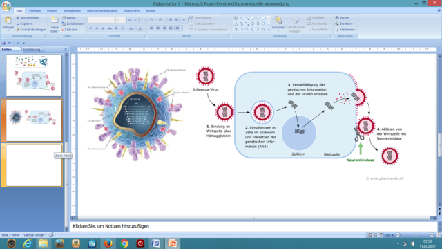 Abb.25 zeigt die Hauptprozesse, wie ein Grippevirus an die Wirtszelle andockt, sich in ihr vermehrt und dann die Wirtszelle als neue Viren wieder verlässt.