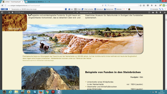 Abb. 27, Quelle Rekonstruktion nach Prof. Dr. Winfried Reiff / Grafik Klaus Bürgle. Das „Stuttgarter Neckartor“ vor 300.000 Jahren. Der Neandertaler am Lagerfeuer nach der Mammutjagd. Auch damals schon: Erhöhte Feinstaubbelastung. Hier durch das Aufwirbeln des Feinstaubs durch die gewaltigen, großen Tiere, dem der Neandertaler (und dessen Vorfahren) schutzlos (!) ausgesetzt war und dem Feinstaub seiner Lagerfeuer. Damals gab es indes noch keine grünen Männchen, die die Mammutjagd, also die Lebensgrundlage verboten und die für unsinnige Projekte wie Moosbegrünung* – das Moos ist mittlerweile abgestorben und die Gelder hinausgeworfen – unsere Steuergelder veruntreuen. Wann sorgen wir dafür, dass die grünen Männchen ab.., Entschuldigung, aussterben?