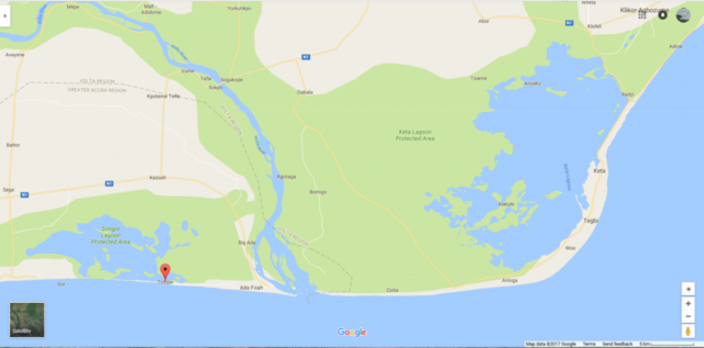 Dabei ist klar, dass im Fall der Ghana-Story vor allem geologisches Wissen und Kenntnisse der Küstendynamik notwendig wären. Werfen wir zunächst einen Blick auf Totope auf einer Google Karte. Der Küstenort liegt in Südost-Ghana: