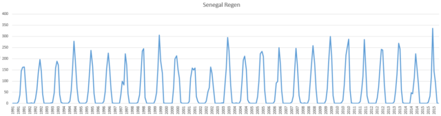 Bild 10 Niederschlagsdaten Senegal in Monatsauflösung 1991 – 2015. Quelle: Klimate Change Knowledge Portal der WORLD BANK GROUP