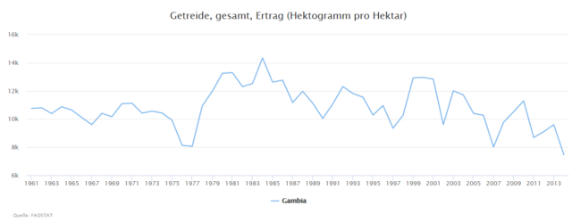 fairhelfen.de: Gambias vielleicht größtes Problem ist die wenig ertragreiche Landwirtschaft, die das Grundgerüst der Wirtschaftsstruktur bildet und die Landbevölkerung kaum ernähren kann. Einziger Devisenbringer ist der Tourismus an der Atlantikküste, während die Industrieproduktion äußerst gering ist. Der jährliche Bevölkerungswachstum von deutlich über zwei Prozent trägt zur Problemverschärfung bei.