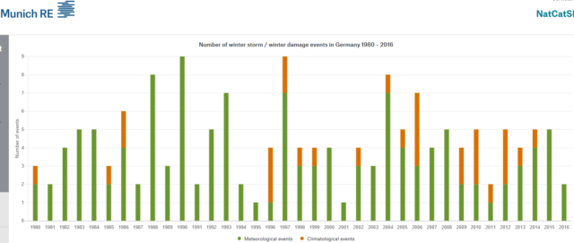 Bild 2 Anzahl Winterstürme in Deutschland seit 1980 (leider gibt es keine Daten zu Sommerstürmen). Quelle: MuRe NatCat-Viewer