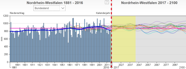 Aufgelöst auf Nordrhein-Westfahlen, wozu das speziell genannte Köln und das Ruhrgebiet gehören, findet der DWD-Klimaatlas ebenfalls nichts Ungewöhnliches. Ausgerechnet in diesem – laut Frau Eckardt besonders betroffenem Bundesland – ist die Zukunftsprojektion zum Jahr 2100 noch langweiliger geradlinig, als für das gesamte Deutschland.