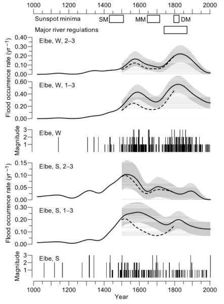 Originaltext zu Bild 12: Figure 7. Occurrence of Elbe floods during winter (W; November–April) and summer (S; May–October), for all flood magnitudes (classes 1–3) and heavy floods only (classes 2–3). Kernel estimation (section 3.2.2.2) using a bandwidth of 35 years is applied to the flood dates (shown as bar charts), obtained from measurements and C. Weikinn’s documentary data (section 2.1) to calculate time-dependent flood risks,b l(t) (solid lines) with bootstrap 90% confidence band (shaded). Records before 1500 are likely not homogeneous (no confidence bands shown). Occurrence rates using documentary entries from database CLIMDAT for 1500–1799 are shown as dashed lines. Also shown are time periods of sunspot minima (SM, Spo¨rer Minimum; MM, Maunder Minimum; DM, Dalton Minimum) taken from Kurths et al. [1997] and the time period of major regulations of the river Elbe.