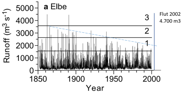Bild 13 Elbe, Fließmengen. Wert der Flut 2002 von 4.700 m3 nach vom Autor nach den Angaben in der Studie ergänzt. Quelle: MUDELSEE ET AL.: EXTREME FLOODS IN CENTRAL EUROPE