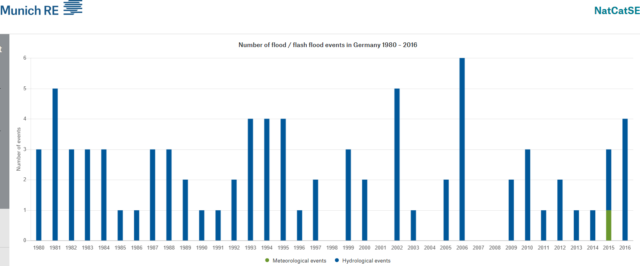 Bild 8 Daten der Münchner Rückversicherungsgesellschaft zu hydrologischen und meteorologischen Ereignissen in Deutschland seit 1970. Vom Autor aus zwei Zeitspannen des NatCat-Viewer zusammengesetzt.