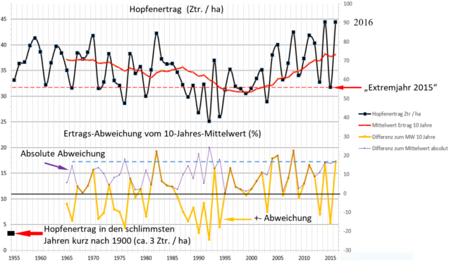 Es könnte natürlich auch einmal sein, dass die Kälte wie um 1975 wieder kommt, als die „Wissenschaftler“ sich sicher waren, dass die nächste Eiszeit begonnen hat. Dann könnte der Hopfen wieder auf ein Achtel des aktuellen Ertrages zurück-geschrumpft sein. Die Hopfenbauern werden sich dann freuen, weil damit der von den GRÜNEN herbeigesehnte „natürliche Idealzustand“ erreicht ist.
