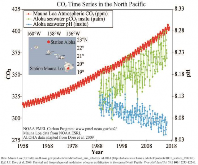 Bild 3-1 [2] Die Grafik rechts zeigt die Entwicklung der CO2-Konzentrationen am Messpunkt Mouna Loa in ppm (rot) sowie den Kohlendioxidpartialdruck (pCO2, Anteil von Kohlendioxid am Gesamtdruck) des Ozeanwasser an der Station Aloha (grün) und den pH-Wert des Wassers, ebenfalls am Messpunkt Aloha
