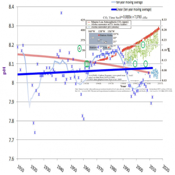 1. Wie kann behauptet werden, daß der pH -Wert seit Beginn der Industrielisierung um 0.1 abgenommen, denn eine weltweit umfassende Messung des pH-werts dürfte es zu der Zeit nicht gegeben haben. Offensichtlich nimmt man sporadische Messungen, deren lokale Bedingungen kaum bekannt sein dürften und schließt daraus auf einen weltweiten Wert. Das scheint mir genauso intelligent als wenn man aus einer Säure mit dem pH-Wert 1 und einer Base mit dem pH-Wert 14 schließt das ganze ist neutral.
