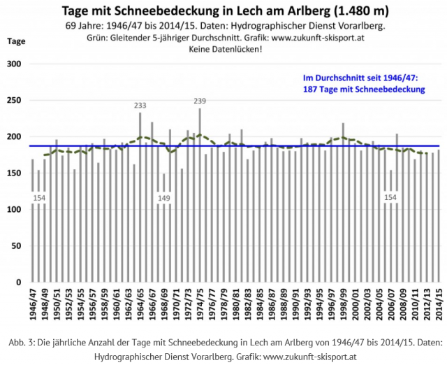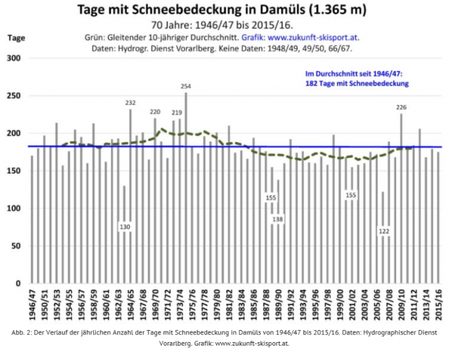 www.zukunft-skisport.at: … Bei den Schneemengen in mittleren Höhenlagen zwischen 1.000 und 2.000 Metern Seehöhe konnte nach Durchsicht der Daten der Österreichischen Hydrographischen Landesdienste innerhalb der letzten 115 Jahre kein Abwärtstrend festgestellt werden. Der Klimawandel stellt für den Skisport im Alpenraum derzeit keine existentielle Bedrohung dar.