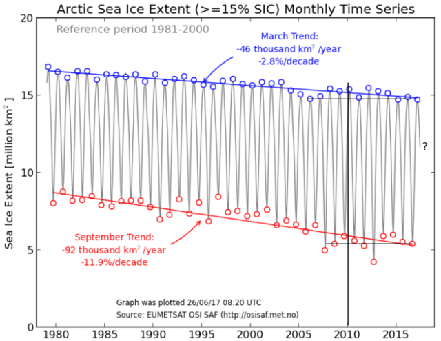 Bild 3-6 Arktis Eisbedeckung Trend März und September seit 1980. Teil der Hilfslinien vom Autor ergänzt. Quelle: DMI Arctic Temperatures