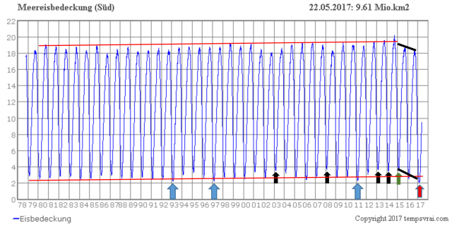 … Sowohl die Maximalausdehnung des arktischen Meereises am Ende des Winters als auch das Minimum am Ende des Sommers ging seit Beginn der Satellitenbeobachtung 1979 stetig zurück. Am Südpol ist der Trend weniger klar, dort nimmt die Ausdehnung des Meereises eher zu; als Grund werden veränderte Windmuster vermutet, die das Meereis weiter auseinandertreiben. Im Winter 2016/17 wurde bei der globalen Meereisfläche (Nord-und Südpol kombiniert) dennoch ein Rekordminus verzeichnet.