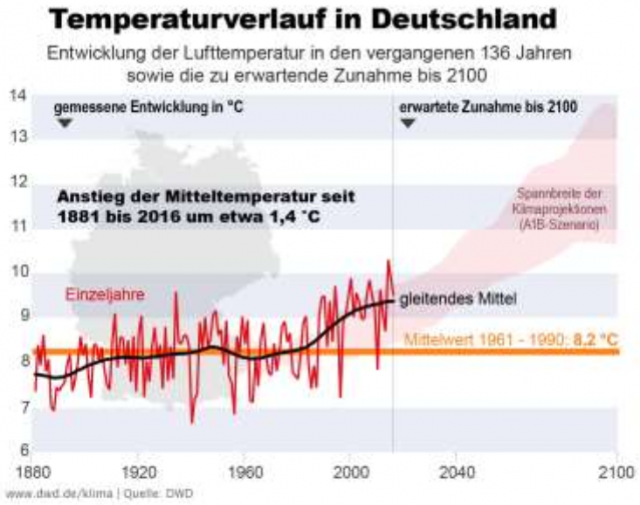 … Die Mitteltemperatur der Luft hat sich laut Daten des Deutschen Wetterdienstes (DWD) seit 1881 um 1,4 °C erhöht. Damit liegt der Temperaturanstieg hierzulande deutlich über dem weltweiten Durchschnitt.