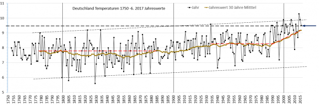 Im folgenden Bild sind die Temperaturen Deutschland seit dem Jahr 1750 gezeigt. Das erkennbare, langfristige Trendband weist einen Anstieg von 0,34 Grad in 100 Jahren aus. Das ist um Welten von dem, was die Simulationen aus dem Verlauf seit 1880 „herauslesen“ entfernt. Die im oberen Bild so drastisch rötlich herausgestellte Zukunftsprojektion verliert ihren Schrecken, weil man ahnen kann, dass sie so nicht eintreffen wird.