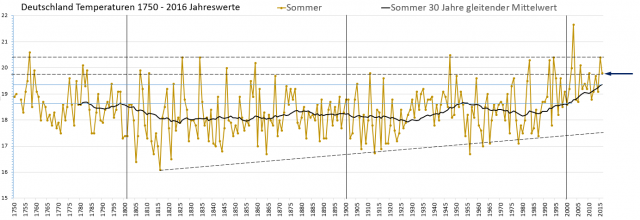 Bild 3-13 Sommertemperatur Deutschland seit 1750. Quelle: DWD (Grafik vom Autor aus der Datentabelle erstellt)