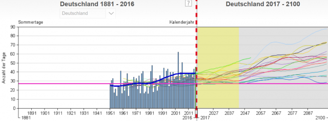 Die Anzahl heißer Tage (Tagesmaximum der Lufttemperatur ≥ 30 °C), über ganz Deutschland gemittelt, ist seit den 1950er-Jahren von etwa drei Tagen im Jahr auf derzeit durchschnittlich neun Tage im Jahr angestiegen. Die mittlere Anzahl der Eistage (Tagesmaximum der Luft-temperatur < 0 °C) hat im gleichen Zeitraum von 28 Tagen auf 19 Tage abgenommen. Auch die Häufigkeit und Intensität von Hitzewellen hat sich in Deutschland verändert. 14-tägige Hitzeperioden mit einem mittleren Tagesmaximum der Lufttemperatur von mindestens 30 °C traten zum Beispiel in Hamburg vor 1994 nicht auf. Seitdem gab es dort solche Ereignisse allerdings schon viermal. Bei ungebremstem Treibhausgas-ausstoßwird für den Zeitraum 2021 -2050 eine weitere Zunahme um fünf bis zehn Heiße Tage in Norddeutschland und zehn bis 15 heiße Tage in Süddeutschland erwartet.