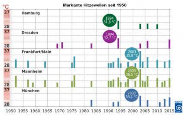 [29] Uba Juli 2015: Klimawandel könnte künftig mehr Hitzetote fordern. Hitzewellen erhöhen das Sterblichkeitsrisiko von Herzkranken um bis zu 15 Prozent. Das ergab eine Studie des Deutschen Wetterdienstes (DWD) für das Umweltbundesamt (UBA). WEB: http://www.dwd.de/klimawandel