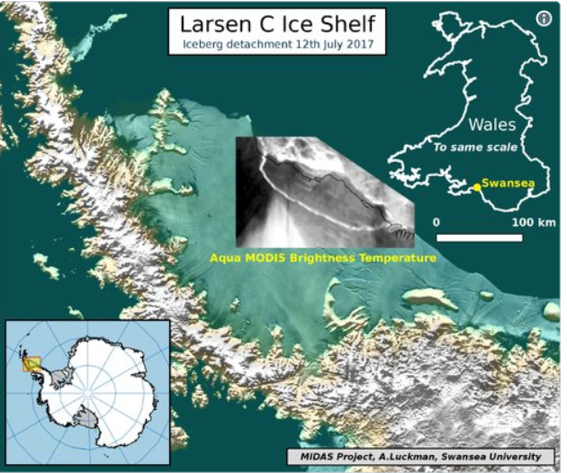 Abb.2, Quelle: MIDAS Project, A. Luckman, Swansea University, zeigt oben das abgebrochene Stück auf der Halbinsel Peninsula in der Westantarktis und kleines Bild unten, den gesamten Südpol.