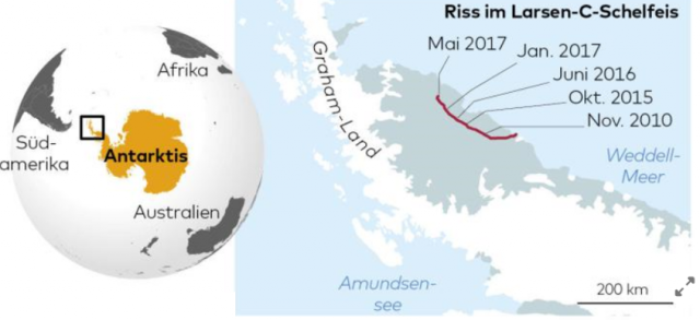 Abb.3, Quelle wie Abb.2, zeigt die verschiedenen Phasen des jetzt final stattgefundenen Eisabbruches. Bereits 2010, also 4 Jahre vor dem Orakel vom PIK-Potsdam war abzusehen, dass sich ein Stück des Schelfeisstückes von Larson C ablösen wird.