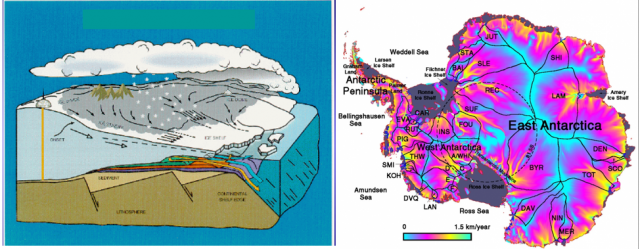 Abb.4 links zeigt schematisch die Ursachen des Eisflusses. Durch Niederschläge wird der Eisschild vergrößert. Durch das zusätzliche Gewicht und dem daraus resultierenden Druck, wird das Eis darunter verdichtet und erhält, wenn der Druckimpuls am Boden ankommt, einen seitlichen Impuls, der wegen der Topographie des Bodens und der Schwerkraft, seitlich zu den Küsten abfließt – das Eis fließt. Verliert das Eis den Grund, bricht es früher oder später. Abb.4 rechts zeigt die unterschiedliche Fließgeschwindigkeit des antarktischen Eisschildes. Zu den Küsten hin wird diese größer.