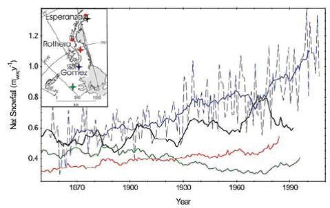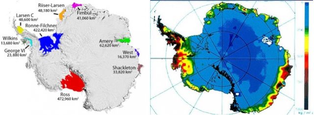 Wie Untersuchungen der British Antarctic Survey ergaben, hat sich insbesondere an den Küsten und besonders auf der antarktischen Halbinsel die Niederschlagsmenge (Schnee) stark erhöht und zwar um über 1 t/m2 pro Jahr (folgende Abbildung rechts). Leicht vorzustellen, welchen Einfluss dieses zusätzliche Gewicht auf die Stabilität der Schelfeisfelder ausübt.