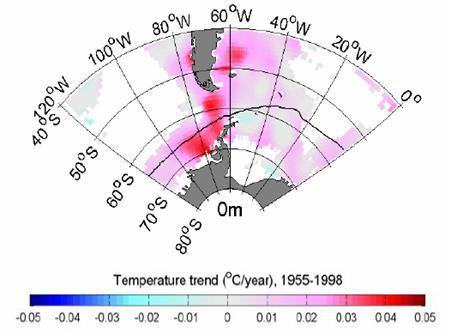 Abb.7 zeigt den Sea Surface-Temperaturtrend von 1955 – 1998 nach den Angaben der POGO (Partnerchip forObservationoftheGlobalOceans). Insbesondere die Gewässer um die antarktische Halbinsel zeigen dabei eine im Vergleich deutliche Temperaturerhöhung. Inwieweit die Daten auf eine Erwärmung des Wassers vor Ort oder auf Meeresströmungen zurückzuführen sind, zeigt Abb.8.