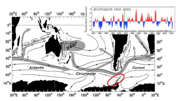 Die Oberflächengewässer der antarktischen Halbinsel werden vorrangig durch die WSSP-Meeresströmung (Western Subtropical South Pacific), die warmes Wasser von der australischen Ostküste an der antarktischen Halbinsel vorbei in den Südatlantik transportiert (folgende Abbildung), bestimmt. Dieser Strom wird stark von der ENSO beeinflusst, die Schwingungscharakter aufweist und von natürlichen Ursachen (Sonne) bestimmt wird.