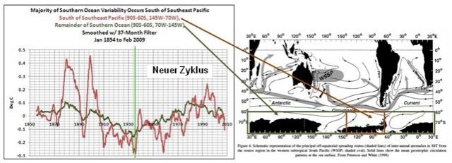 Abb.8 zeigt die Meeresströmungen im Südpazifik (Quelle: Prof. John Turner, “The ElNiño-Southern OscillationandAntarctica“, International Journal of Climatology, 2004) und dazu den ENSO-Index von 1950 – 2010, Quelle: (http://www.esrl.noaa.gov/psd/enso/enso.mei_index.html). Ab 1977 lässt sich eine Änderung der ENSO erkennen. Sie wechselt ins Positive. Damit ist erklärbar, warum vermehrt warmes Wasser an die Westantarktis gelangt (rot umrundet). Da die ENSO wie alle Ozeanoszillationen zyklisch ist, ist mit einem erneuten Wechsel zu rechnen.