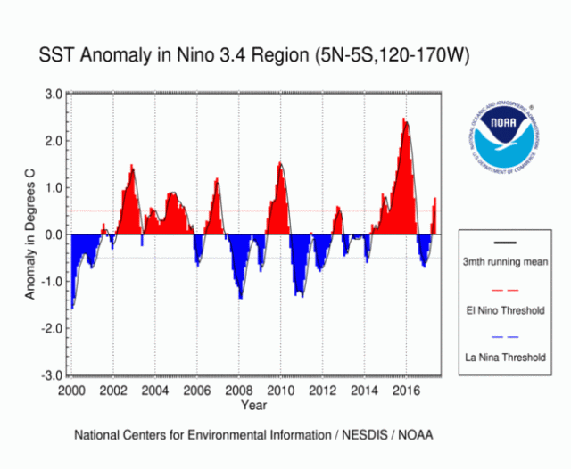 Abb. 12 zeigt einen wesentlichen Teil der ENSO, die El Niño 3.4 (bezieht sich auf ein entsprechendes Gebiet im Pazifik). Deutlich ist der starke El Niño vor ca. 1 ½ Jahren zu sehen, der den Eisabbruch sicherlich beschleunigte, Quelle NOAA aus (https://wattsupwiththat.com/reference-pages/climatic-phenomena-pages/enso/). und der ein reines natürliches Ereignis ist. Siehe hierzu z.B. die EIKE-Artikel des Autors zur Sonne und El Niño: