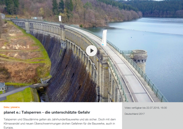 ZDF planet e: [2] … Die Autoren Volker Wasmuth und Patrick Zeilhofer fragen in „planet e.“ nach: Wie sicher sind Europas Talsperren wirklich? Reichen die vorhandenen Alarmsysteme aus? Brauchen wir solche Jahrhundertbauwerke überhaupt? Ist womöglich sogar ein komplettes Umdenken nötig, um die neuen Klimagefahren durch schmelzende Gletscher, Bodenerosion und schwere Unwetter in den Griff zu bekommen?