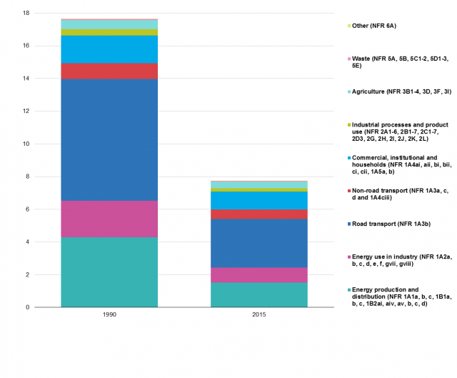 Abb.18 zeigt die EU-28 Stickoxidemissionen im Jahr 1990 und 2015 in Mt, Quelle: (http://ec.europa.eu/eurostat/statistics-explained/index.php/File:Emissions_of_nitrogen_oxides_by_source_sector,_in_million_tonnes,_EU-28,_1990_and_2015_update.png)