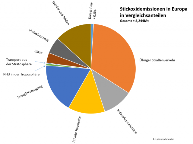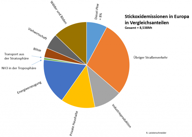 Der Gesamtanteil aller europäischen Diesel-Pkw an den Stickoxiden, liegt nur unwesentlich höher, als die Gewitter / Blitze über Europa im Jahr verursachen. Mit einem %-Anteil von gegenwärtig 8% (7%) an den Gesamt-Stickoxid-Emissionen in Europa darf getrost ein gesundheitlicher Einfluss ausgeschlossen werden (siehe Gewittertätigkeit und Wald). Fahrverbote dienen den auch nicht unserer Gesundheit, sondern persönlichen / kommerziellen, sowie politischen Interessen. Die Qualitätsmedien haben einmal mehr unter Beweis gestellt, dass sie von dem, was sie schreiben, nicht die leiseste Ahnung haben. Als der VW-Chef sich beim Dieselgipfel gegen den Vorwurf eines „Versagens der Automobilindustrie“, wie gezeigt, zurecht, wehrte wurde dies in ZDU-heute dahingehend kommentiert, hier läge Uneinsichtigkeit vor.