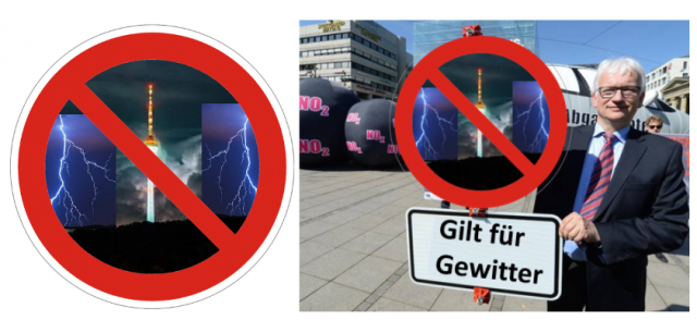 Abb.23: Vorschlag des Autors an die grünen Männchen in Stuttgart und „ihrer“ (siehe Abb.24) Deutschen Umwelthilfe zu einem Verbotsschild für Gewitter, aufgrund deren vergleichbar hohen Stickoxidemissionen wie von Diesel-Pkw. Und der Geschäftsführer der DUH könnte dann so medienwirksam für das Verbot werben. Soll nur ein Vorschlag sein. Collage: R. Leistenschneider