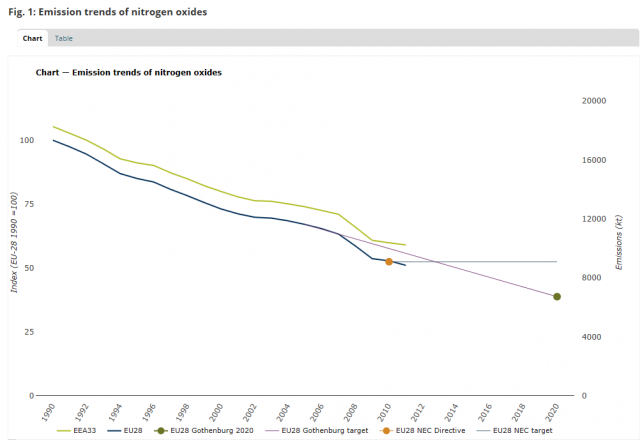 Abb.25, Quelle: Europäische Umwelt Agentur, zeigt die europäischen Gesamt-Stickoxidemissionen und deren Entwicklung seit 1990. Der Stickoxidausstoß fällt rapide um 50%.