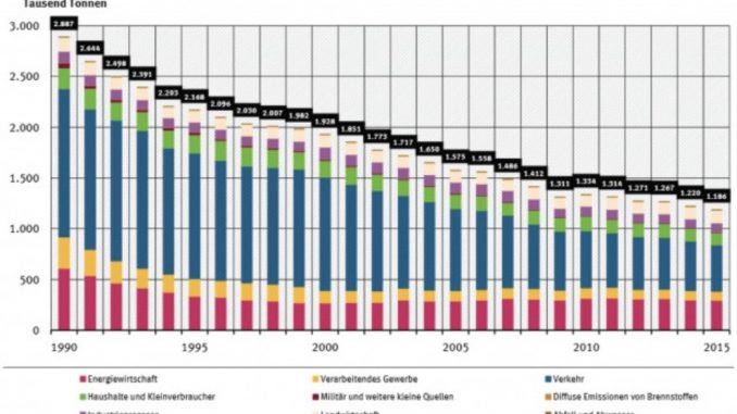 Die Kurve in der Tabelle geht nach unten, die Werte sinken seit 27 Jahren kontinuierlich. Für das Jahr 2015 liest man in der Tabelle den Wert von 1,186 Mio Tonnen pro Jahr ab. Das bedeutet: fast 40 % weniger Stickoxide in der Luft als 1990.
