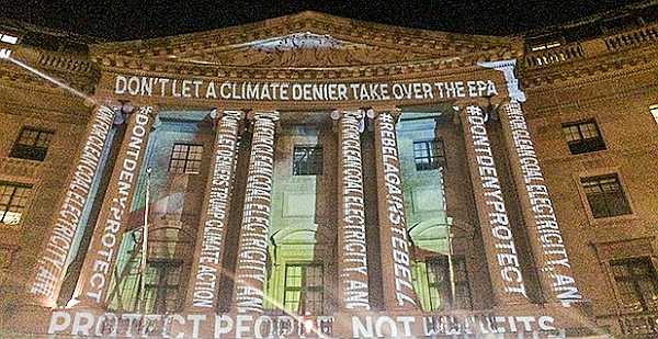 Er stand im Fokus der Proteste, sein Name wurde mit Beamern auf das EPA-Gebäude projektiert und es kamen Rufe: „Stoppt den schlimmen Myron Ebell!“