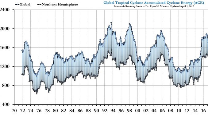 Die Graphik mit der Accumulated Cyclone Energy stammt von dem Meteorologen Ryan Maue am Cato-Institut.