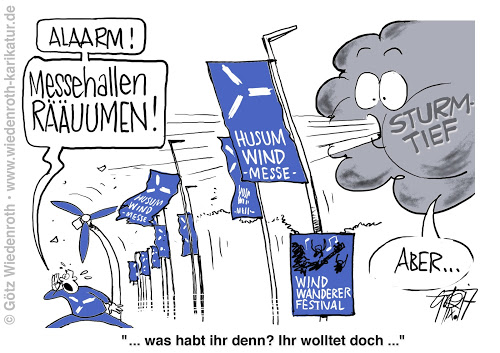 Die Windbegeisterung ist freilich auch in der Nordseefischerstadt Husum nicht uneingeschränkt. Am zweiten Tag der Windmühlenmesse war es den Husumer Masters of Wind („Wir können Wind. Schon immer.“) dann doch ein wenig zu viel, denn Sturmtief „Sebastian“ schaute als ausgewiesener Fachmann neugierig vorbei, um sich die Storm-Gedenktafeln benebst der „windigen“ Geschäfte von wahnsinnig erfolgreichen Steuergeld- und Energieeinspeisungs-Nutznießern einmal aus der Nähe anzusehen – und zeigte ihnen mal so richtig, was eine Windharfe ist. Da pfiff es nicht nur in die Räder und Hallenzelte, sondern auch in die profitbeschwerte Büx: Man entschied, die Hallen erstmal zu räumen und später, bei günstigerem Wind, weiterzutraden. „Heute hat sich in Husum wieder gezeigt: Mit Wind in jeder Form können wir umgehen“, erklärt selbstbewußtPeter Becker, Geschäftsführer der Messe Husum & Congress. Er fährt fort: „Sturmtief Sebastian hat gestern einiges durcheinander gewirbelt, dennoch lief die Räumung der Hallen geordnet ab. Dafür möchte ich mich herzlich bei den Besuchern sowie Ausstellern und nicht zu letztlich bei der Feuerwehr für Ihre Unterstützung bedanken – wenn es ernst wird, hält die Windbranche zusammen.“