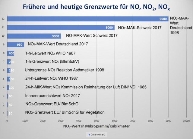 Über mögliche Beeinträchtigungen durch NO2 in Abgasen für die Allgemeinheit sollte man daher nur im Zusammenhang mit den Dosierungen sprechen, die tatsächlich in der Luft unserer Städte vorliegen. Das sind im Mittel nirgendwo mehr als 90 µg/m3 mit seltenen Spitzen bis etwas über 200 µg/m3. Dieser Wert ist gleichzeitig die Geruchsgrenze, d.h. man kann nicht unbemerkt vergiftet werden. In diesem Konzentrationsbereich ist NO2 nicht giftig, sondern lediglich ein Reizstoff für die Lunge. Der Grenzwert für die Dauerbelastung von Mitarbeitern bei körperlicher Arbeit (MAK-Wert) lag früher in Deutschland bei 9.000 µg/m3 und wurde erst Anfang der 2000er Jahre auf 950 µg/m3 reduziert, in der Schweiz liegt er sogar bei 6.000 µg/m3. Bis zu dieser Schwelle ist NO2 also kein Gift, sondern lediglich ein Reizstoff, dem man als gesunder Erwachsener bis zu rund 1.500 Stunden pro Jahr ausgesetzt sein kann, ohne nachteilige gesundheitliche Auswirkungen befürchten zu müssen. MAK-Werte werden von einer Kommission festgelegt, die mit Fachleuten aus verschiedensten Bereichen wie z.B. der Toxikologie und der Arbeitsmedizin oder der Lungenheilkunde besetzt sind. Sie werden so definiert, dass sie nach aktuellem Kenntnisstand der Medizin sicher unterhalb der Gefährdungsgrenze liegen.