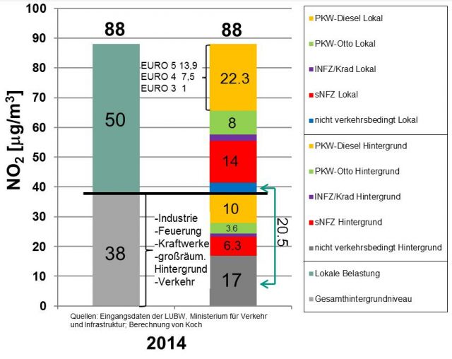 Bei dieser Untersuchung von Professor Koch wurde zwischen Hintergrundgehalten – entfernter liegende Quellen, deren Abgase bereits großräumig verteilt wurden – und lokalen Quellen unterschieden. Da es bei dieser Art der Darstellung schwieriger wird, den Beitrag der einzelnen Quellen optisch leicht fasslich darzustellen, wurde zusätzlich eine zusammenfassende Grafik erstellt, Bild 14.