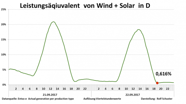 Wer hätte das gedacht? Jetzt im Herbst werden die Tage wieder kürzer. Im Osten der Republik ist es um 20.00 Uhr bereits dämmrig. Aber um 18:00 Uhr scheint – wenn die Sonne scheint- auch dort noch die Sonne, wenn auch nur im milden, rötlichen Abendlicht. Das kommt von der Physik der Planetenbahnen um die Sonne und dagegen kann man nichts machen. Und dann legen sich auch als Erste -trotz bester sonniger Wetterlage- die Solarstromerzeuger zum wohlverdienten Schlafe nieder. Immerhin sind 2017 bereits sehr viele von ihnen in Lohn- und Brot. Satte 43,3 GW an Leistung (nur zur Spitzenzeit versteht sich) sind in rd. 1,6 bis 1,7 Mio – so genau zählt das keiner mehr- an Solareinspeisern im Lande aktiv. Sie haben– wenn auch nur ganz kurz- um 12:00 Uhr Mittags des 21.9.17 – knapp die Hälfte ihrer installierten Leistung geliefert . Immerhin 20.594 GW! Dann aber legten sie sich schnell zur Ruhe. Um 16:00 Uhr waren es nur noch knapp 25% und um 18:00 Uhr nur noch 3,5 %. Um wenig später ganz auf Null zu gehen.