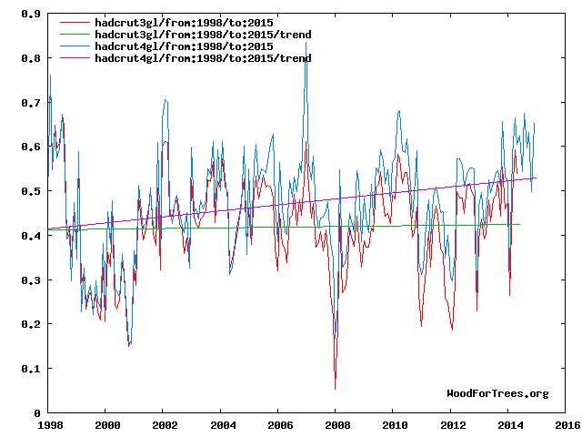 Abb. 1: Entwicklung der globalen Temperaturen gemäß früherer Version HadCRUT3 im Vergleich zum aktuellen HadCRUT4-Datensatz. Graphik: Woodfortrees.