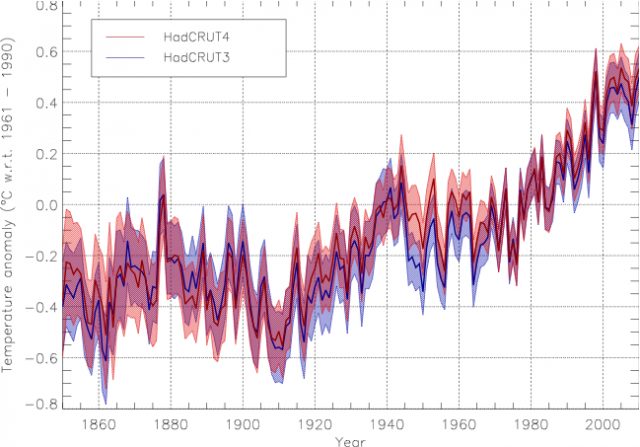 Abb. 2: Entwicklung der globalen Temperaturen gemäß früherer Version HadCRUT3 im Vergleich zum aktuellen HadCRUT4-Datensatz. Graphik: Realclimate.