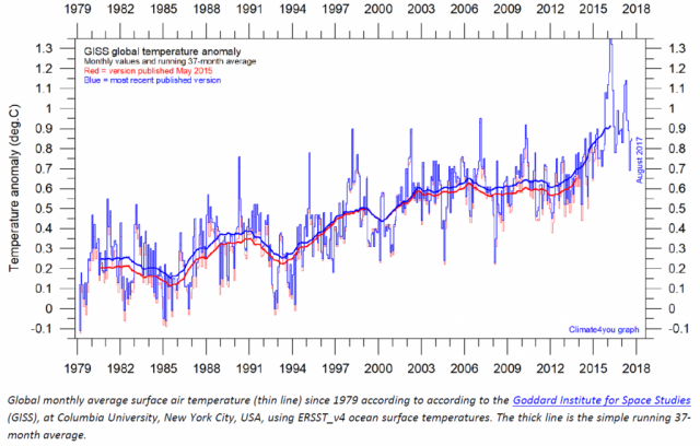 Abb. 3: Entwicklung der globalen Temperaturen gemäß früherer GISS-Version aus dem Mai 2015 (rot) im Vergleich zum aktuellen GISS-Datensatz (blau). Graphik: Climate4You.
